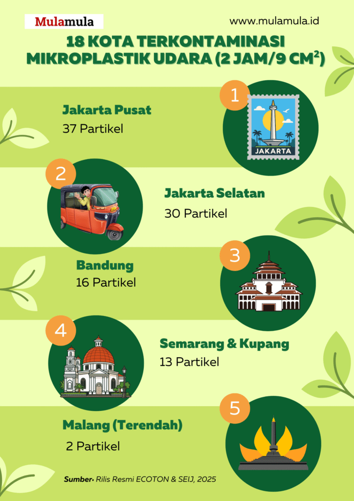 Riset terbaru Lembaga Kajian Ekologi dan Konservasi Lahan Basah (ECOTON) bersama Masyarakat Jurnalis Lingkungan Indonesia (SEIJ) membuktikan hal itu. Hasil kajian yang dirilis di laman resmi ecoton.or.id pada 23 Oktober 2025 menemukan 18 kota dan kabupaten di Indonesia terkontaminasi mikroplastik udara.
