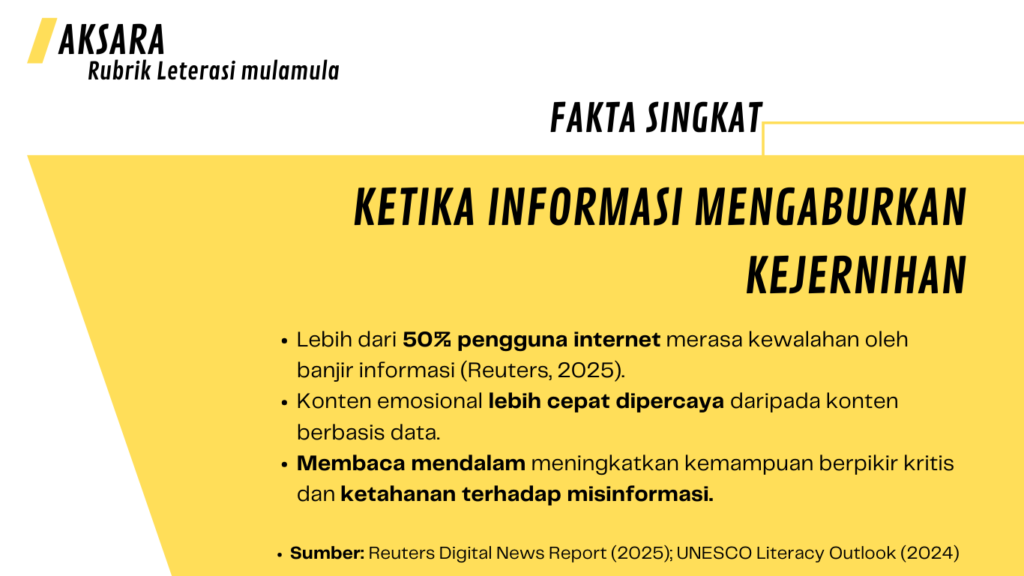 Menurut Reuters Digital News Report (2025), lebih dari separuh pengguna internet mengaku merasa kewalahan oleh banjir informasi dan kesulitan membedakan mana yang faktual dan mana yang manipulatif.