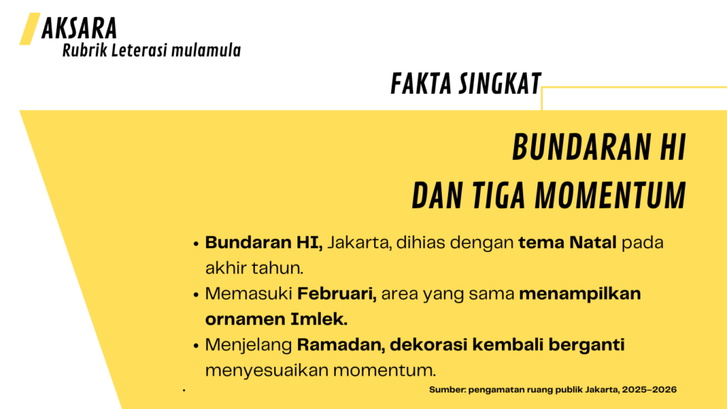DI PENGHUJUNG tahun, Bundaran HI, Jakarta, bersinar dengan ornamen Natal. Lampu tematik dan dekorasi musiman menghiasi ruang yang setiap hari menjadi titik temu ribuan orang.