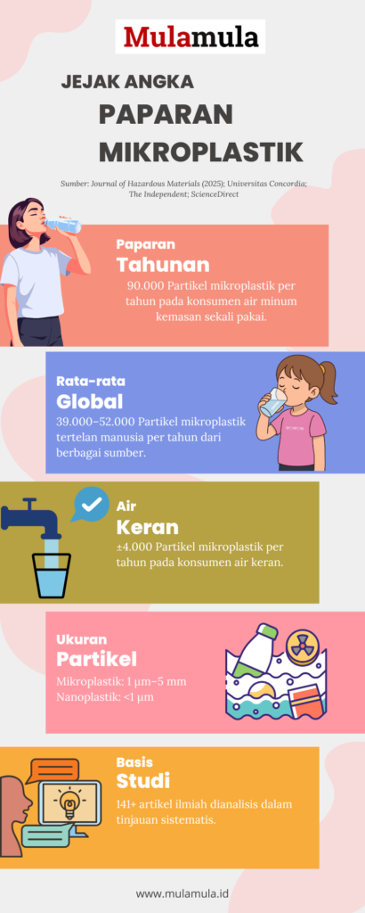 Rata-rata manusia diperkirakan menelan 39.000 hingga 52.000 partikel mikroplastik per tahun dari berbagai sumber. Namun, pada konsumen air kemasan, angka itu melonjak drastis. Sementara pada peminum air keran, paparannya jauh lebih rendah.