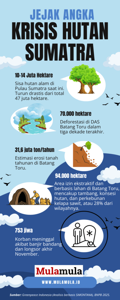 Data Greenpeace Indonesia memberi gambaran gelap. Kurang dari sepertiga hutan alam Sumatra kini masih tersisa. Selebihnya hilang dalam 34 tahun terakhir, terutama berubah menjadi sawit, pertambangan, hingga hutan tanaman industri.