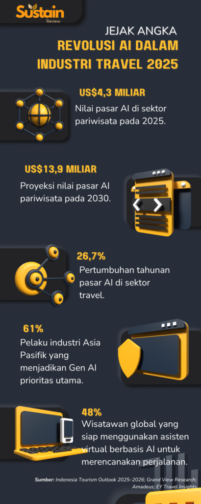 Menurut Grand View Research dalam Indonesia Tourism Outlook 2025–2026, nilai pasar AI di sektor pariwisata diprediksi menyentuh US$4,3 miliar tahun 2025 dan melonjak ke US$13,9 miliar tahun 2030. Pertumbuhannya brutal, 26,7% per tahun.