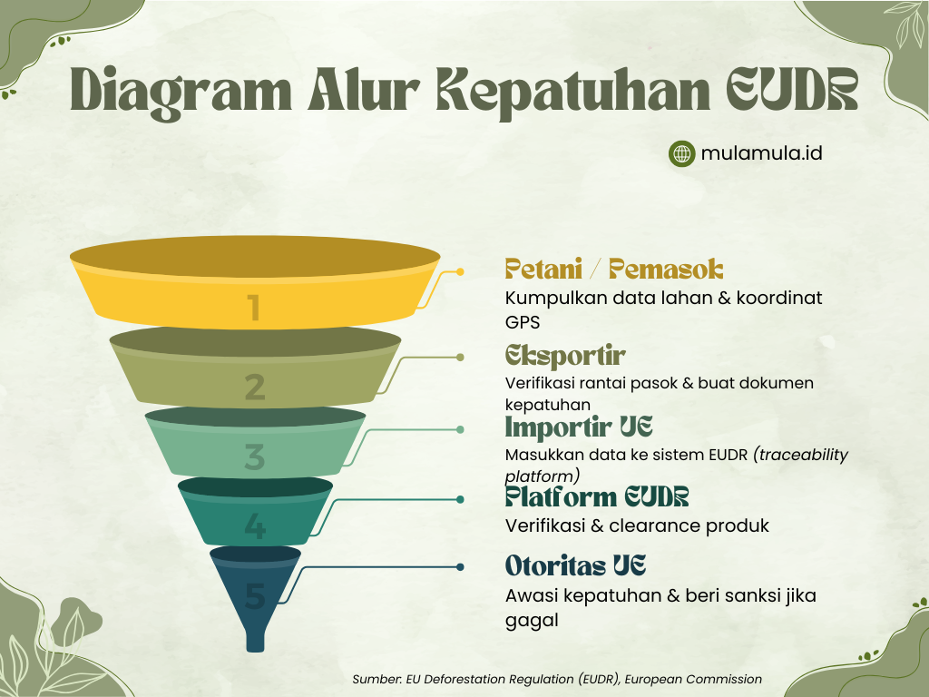 EUDR diterbitkan pada 2021 untuk memastikan komoditas yang dijual di pasar Eropa — seperti minyak sawit, daging sapi, kedelai, kakao, kopi, karet, dan kayu — tidak berasal dari lahan yang mengalami deforestasi setelah 31 Desember 2020.