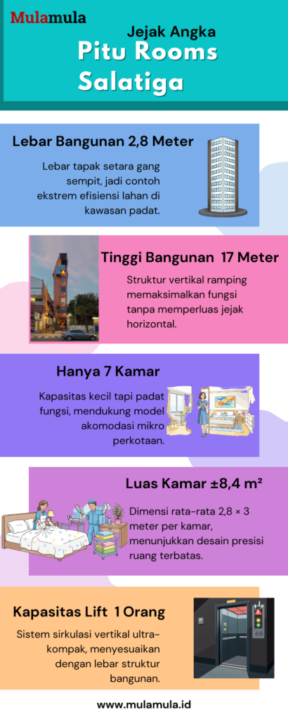 Sementara itu, Pitu Rooms di Salatiga memang sedikit lebih lebar. Namun dari sisi fungsi, hotel ini jauh lebih padat. Ada tujuh kamar yang bisa menampung hingga 14 tamu sekaligus. Jadi meski bukan yang paling tipis di dunia, dari segi kapasitas Pitu Rooms justru lebih unggul.