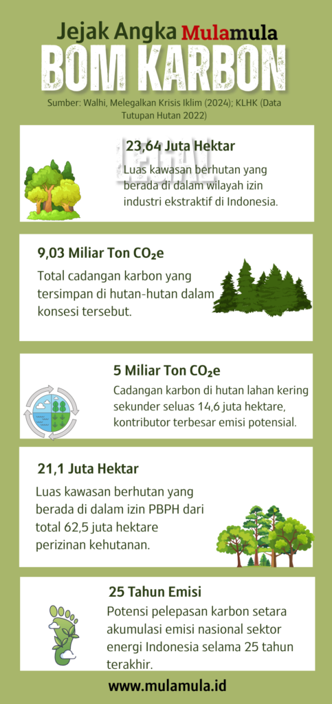 Temuan ini diungkap Wahana Lingkungan Hidup Indonesia (Walhi). Dalam laporan terbarunya Melegalkan Krisis Iklim, Walhi mencatat 23,64 juta hektare kawasan berhutan berada di dalam wilayah izin industri ekstraktif. Mulai dari pertambangan, kehutanan, hingga sektor berbasis lahan yang kini dikaitkan dengan proyek transisi energi.