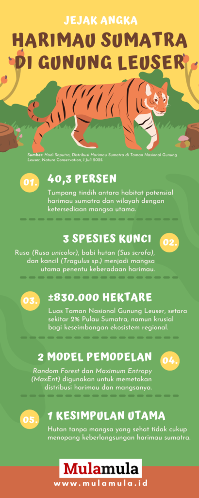 Studi yang dilakukan di Taman Nasional Gunung Leuser menunjukkan hal itu dengan jelas. Wilayah yang paling sering dihuni harimau adalah area dengan mangsa yang melimpah. Hasil pemetaan bahkan memperlihatkan tumpang tindih hingga 40,3 persen antara habitat ideal harimau dan wilayah dengan ketersediaan mangsa utama.