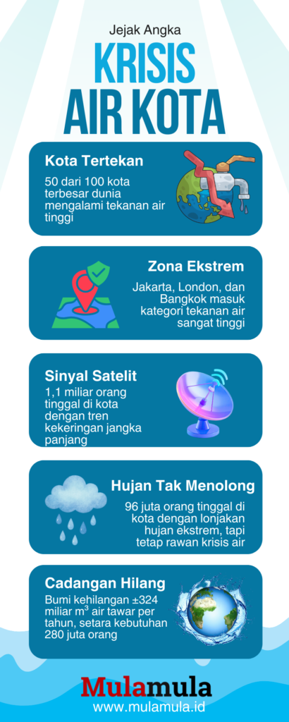 Jakarta bukan kasus tunggal. Separuh dari 100 kota terbesar dunia kini hidup dalam kondisi tekanan air tinggi. Sebagian kota makin kering, sebagian lain justru mengalami hujan makin ekstrem.