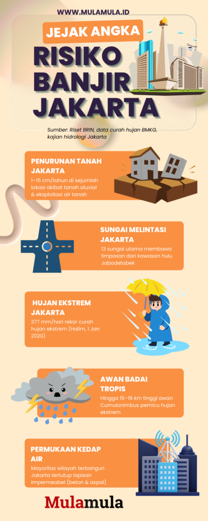 Dampaknya, posisi Jakarta makin rendah dibanding muka laut. Air hujan dan air sungai jadi makin sulit mengalir ke laut. Sistem pompa dan tanggul harus bekerja lebih keras.