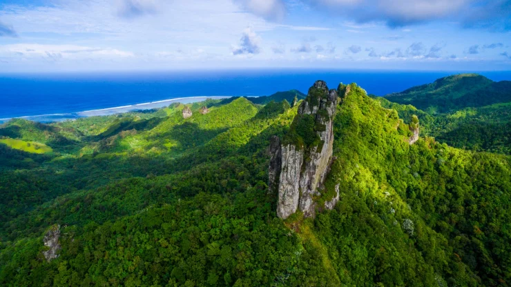 Pemandangan udara formasi batuan terjal Te Rua Manga di Pulau Rarotonga, Kepulauan Cook, dikelilingi hutan tropis lebat dan laut biru yang membentang di kejauhan. Foto: smh.com.
