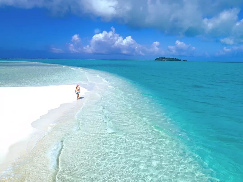 Wisatawan berjalan menyusuri pasir putih dan air sebening kristal di Kepulauan Cook. Destinasi bebas visa yang menawarkan ketenangan dan panorama laut yang menakjubkan. Foto: Cookislands.Travel.