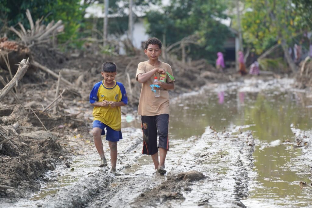 Anak-anak melintasi jalan berlumpur di kawasan terdampak banjir di kawasan Meureudu, Pidie, Jaya, Aceh. Kerusakan infrastruktur masih menghambat aktivitas warga, memasuki hari ke-18 pascabanjir besar Sumatra. Foto: HO/ Pilo Poly.