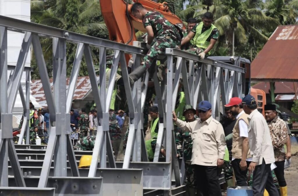 Langkah itu diumumkan di lokasi Jembatan Bailey Teupin Mane, Kutablang, Bireuen. “Beliau punya pasukan zeni dan konstruksi. Bisa bergerak cepat,” ujar Prabowo.