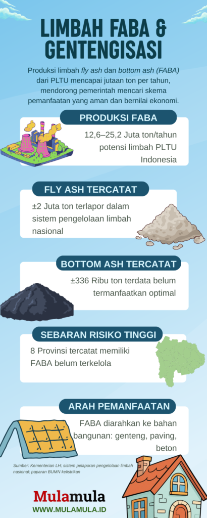 Program yang disebut “gentengisasi” ini mendorong pemanfaatan fly ash dan bottom ash (FABA), sisa pembakaran batu bara di PLTU, sebagai campuran bahan genteng tanah liat. Gagasan ini sempat disampaikan Presiden Prabowo Subianto, yang ingin mendorong penggunaan genteng lokal sekaligus memanfaatkan limbah batu bara.