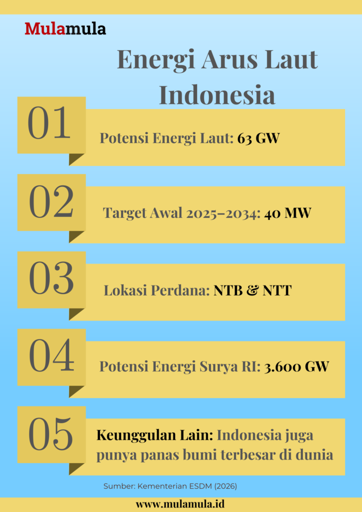 Kementerian Energi dan Sumber Daya Mineral (ESDM) memastikan pemanfaatan arus laut masuk dalam rencana pengembangan listrik 2025–2034. Artinya, pembangkit listrik tenaga arus laut bukan lagi wacana.