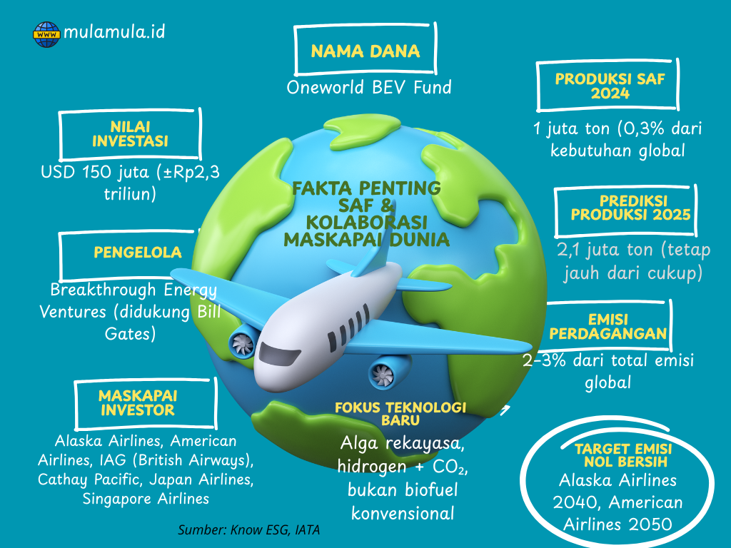 Enam maskapai dunia sepakat patungan USD 150 juta lewat oneworld BEV Fund untuk dorong lahirnya bahan bakar penerbangan berkelanjutan (SAF). Targetnya jelas: kurangi emisi 2–3% dari sektor aviasi yang kini masih bergantung pada fosil. Desain Grafis: Daffa Attarikh/ MulaMula.