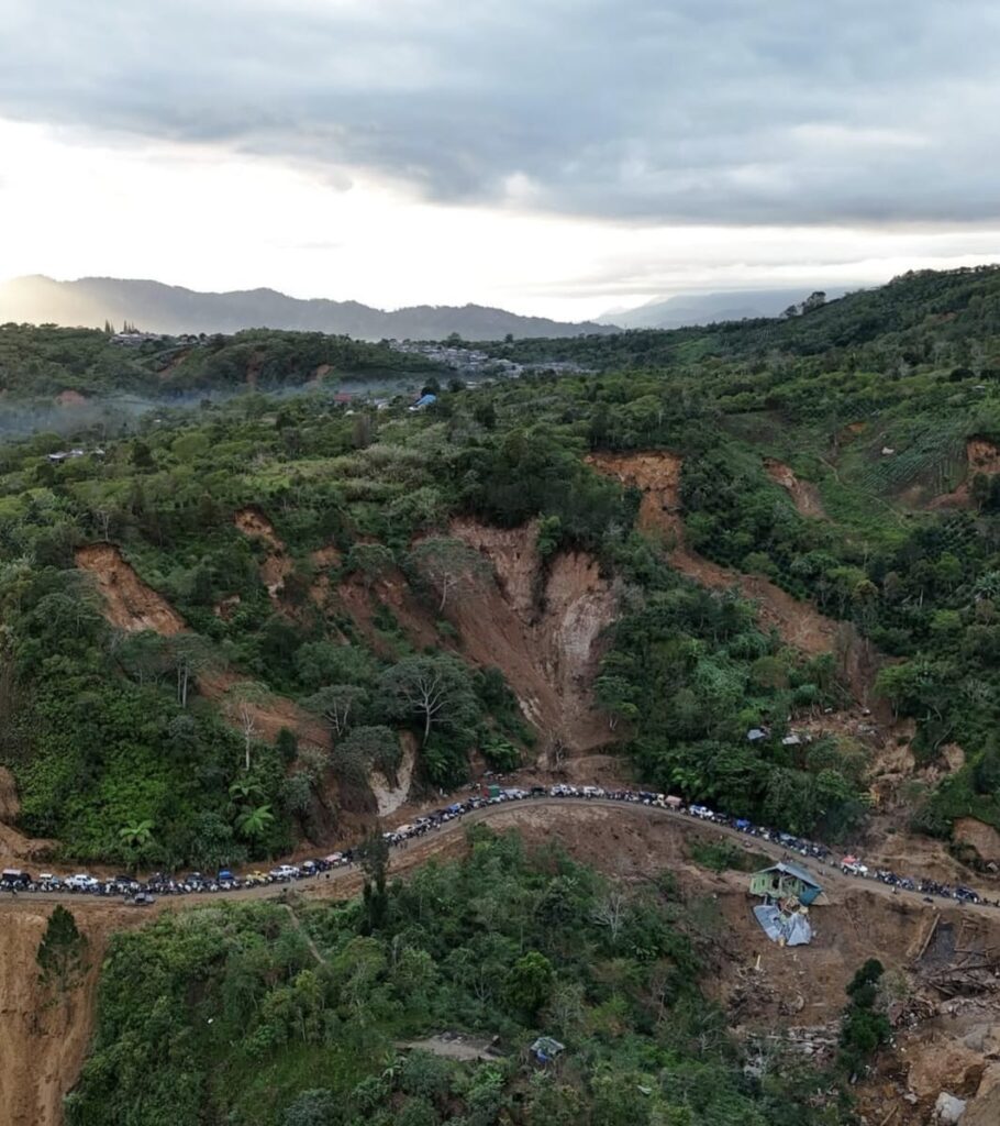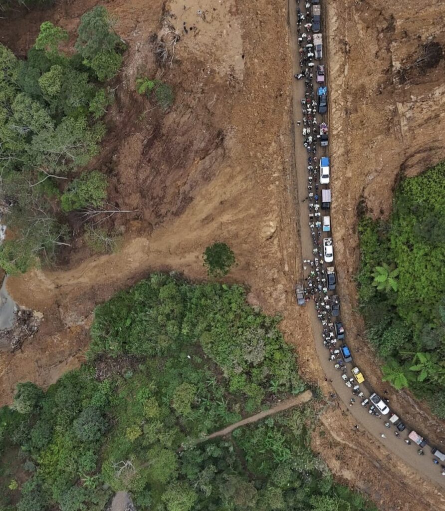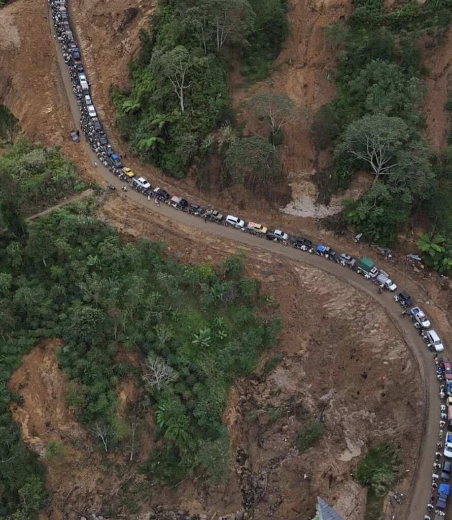 Dari udara, antrean kendaraan tampak panjang dan rapuh. Truk logistik, mobil bak terbuka, sepeda motor, hingga kendaraan warga bercampur di satu jalur sempit. Semua bergerak pelan. Sangat pelan.