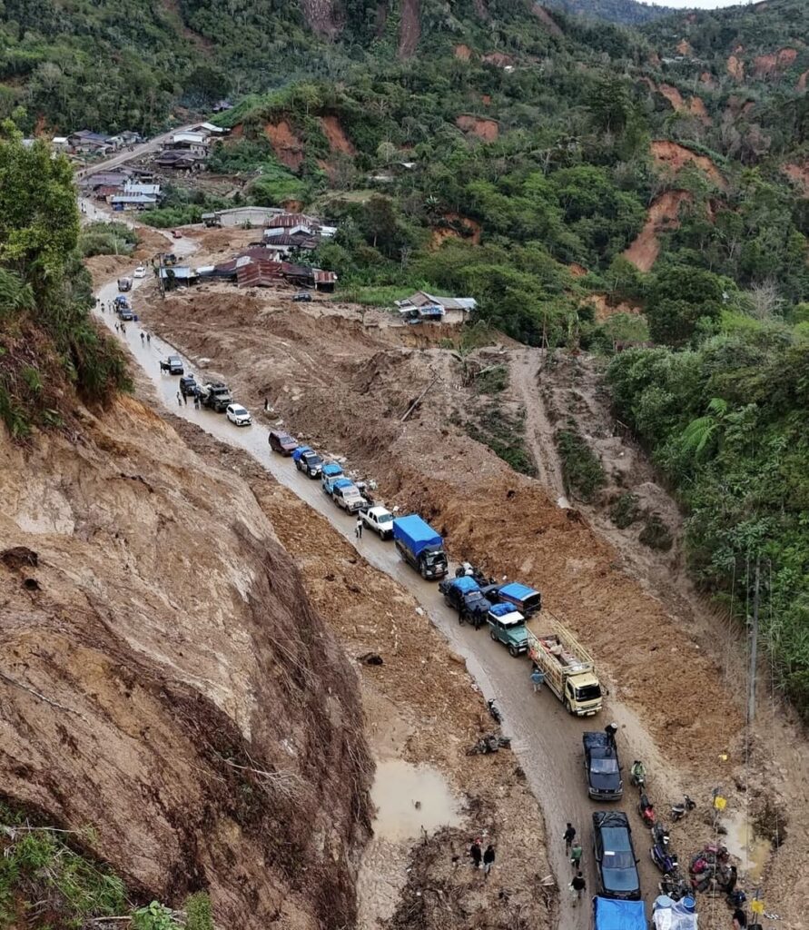 Di simpang KKA Camp 16, sisa longsoran membelah perbukitan. Tebing terkelupas. Tanah merah menganga. Jalur yang tersisa hanya cukup untuk satu kendaraan dalam satu waktu.