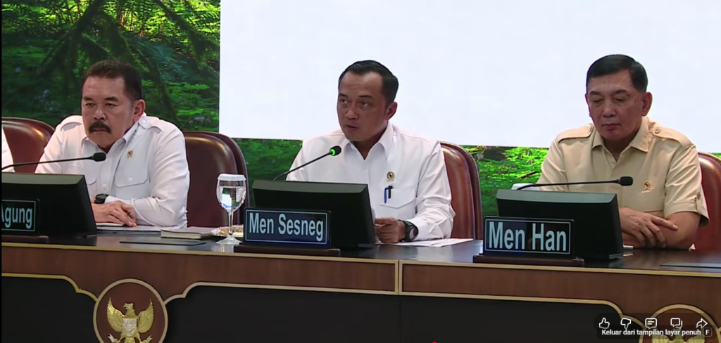 Menteri Sekretaris Negara Prasetyo Hadi menyampaikan keputusan pencabutan izin pengelolaan kawasan hutan dalam konferensi pers di Istana Negara. Foto: Setpres.