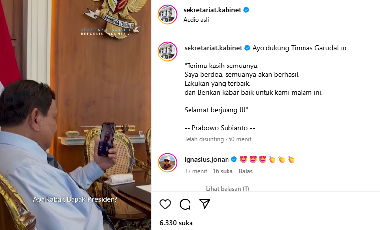 Momen itu dibagikan akun Instagram Sekretariat Kabinet, Rabu (8/10/2025). Dalam unggahan tersebut, Prabowo tampak mengenakan kemeja dan dasi, memegang ponsel, dan berbicara langsung dengan pelatih timnas, Patrick Kluivert.