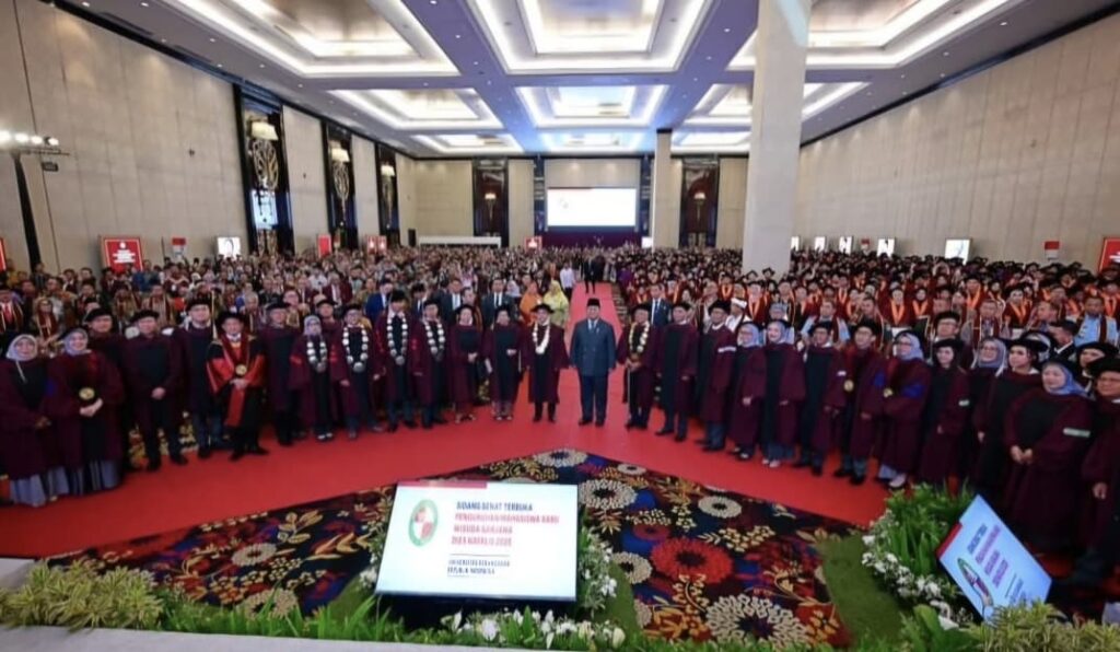 Presiden Prabowo Subianto bersama jajaran pimpinan Universitas Kebangsaan Republik Indonesia dan ribuan wisudawan seusai acara sidang senat terbuka di Bandung, Sabtu (18/10/2025). Foto: Instagram/ sekretariat.kabinet.