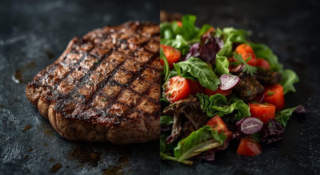 Daging merah dan menu berbasis sayuran. Pemerintah Prancis mendorong pembatasan konsumsi daging demi kesehatan dan pengendalian emisi karbon. Foto: Ilustrasi.