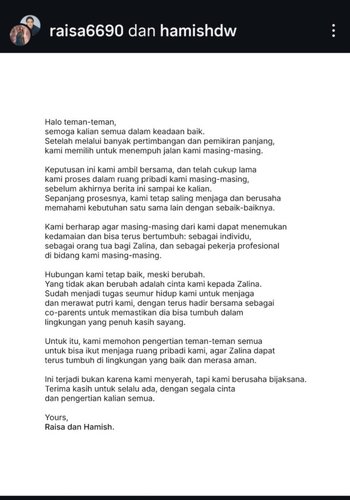 Meski begitu, Raisa dan Hamish menegaskan bahwa keputusan ini bukan langkah spontan. Mereka sudah melalui proses panjang di ruang pribadi, mencoba memahami satu sama lain.