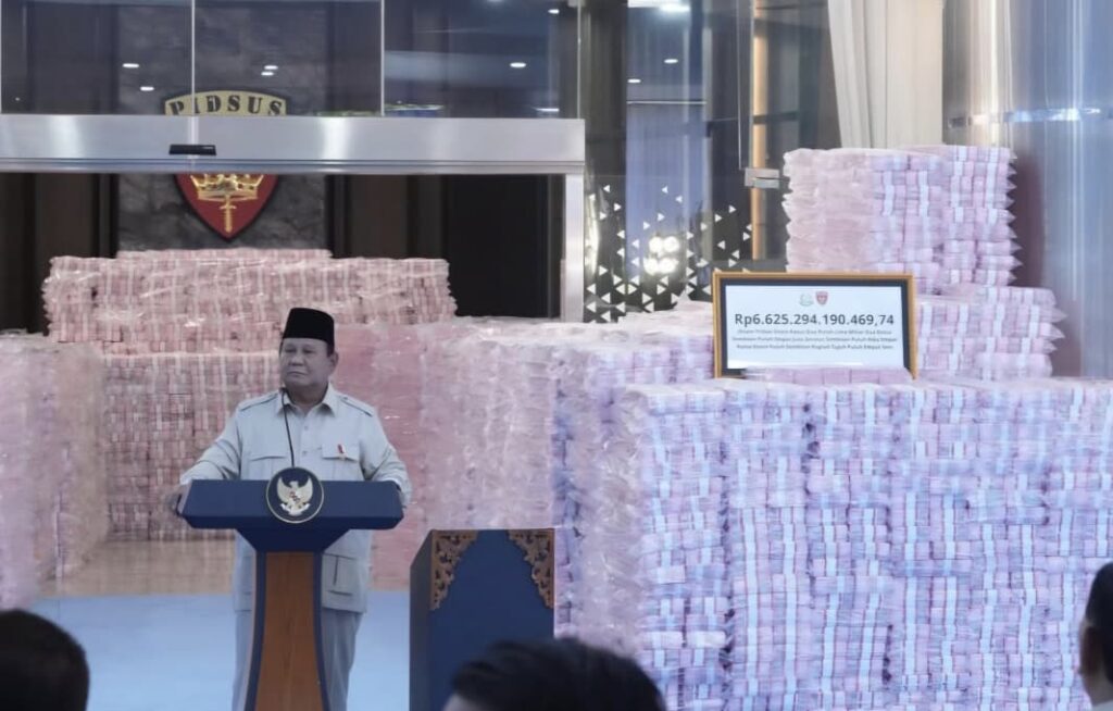Penyerahan uang hasil denda dan sitaan tersebut berlangsung di Gedung Bundar Kejaksaan Agung, Jakarta Selatan, Rabu (24/12/2025). Acara itu turut dihadiri Presiden Prabowo Subianto bersama Jaksa Agung ST Burhanuddin serta jajaran menteri Kabinet Merah Putih.