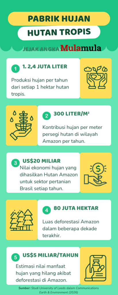 Sebuah studi terbaru dari University of Leeds menemukan bahwa setiap satu hektar hutan tropis bisa menghasilkan sekitar 2,4 juta liter hujan setiap tahun. Angka itu dihitung lewat kombinasi data satelit dan model iklim terbaru.